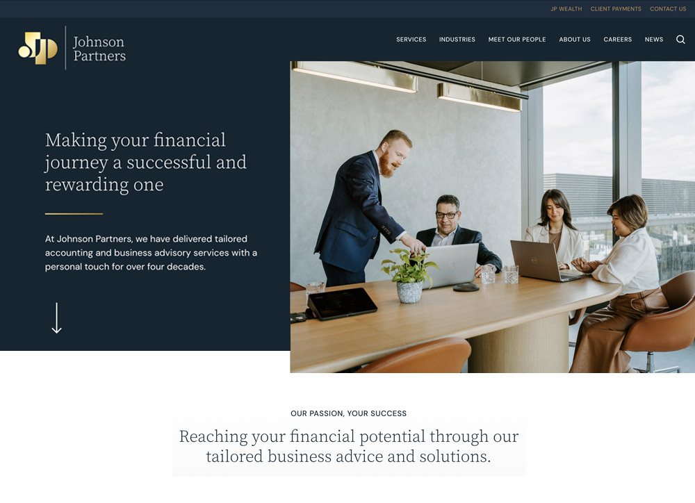 Johnson Partners and JP Wealth Management, two successful financial services firms, sought a brand refresh to accurately represent their exceptional service, talented staff, and forward-thinking work environment. Twin Moon Studios was enlisted to modernise and enhance their brands, crafting tailored content and websites to effectively communicate each business’s distinct needs and service offerings. Our comprehensive approach, from the refreshed logo to cohesive marketing materials, has garnered positive feedback from existing clients and aided in recruiting new employees, fulfilling a crucial objective for the businesses.